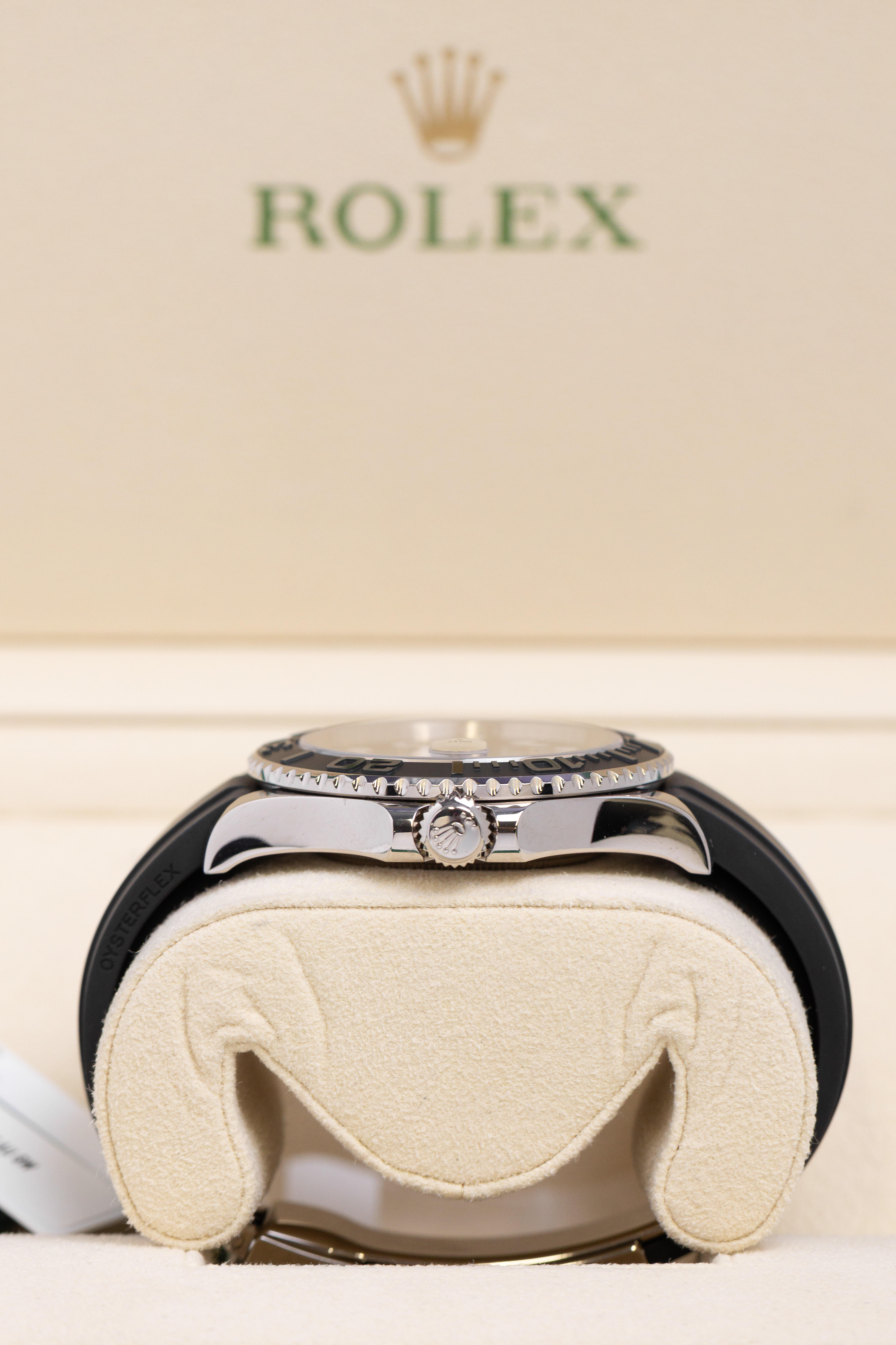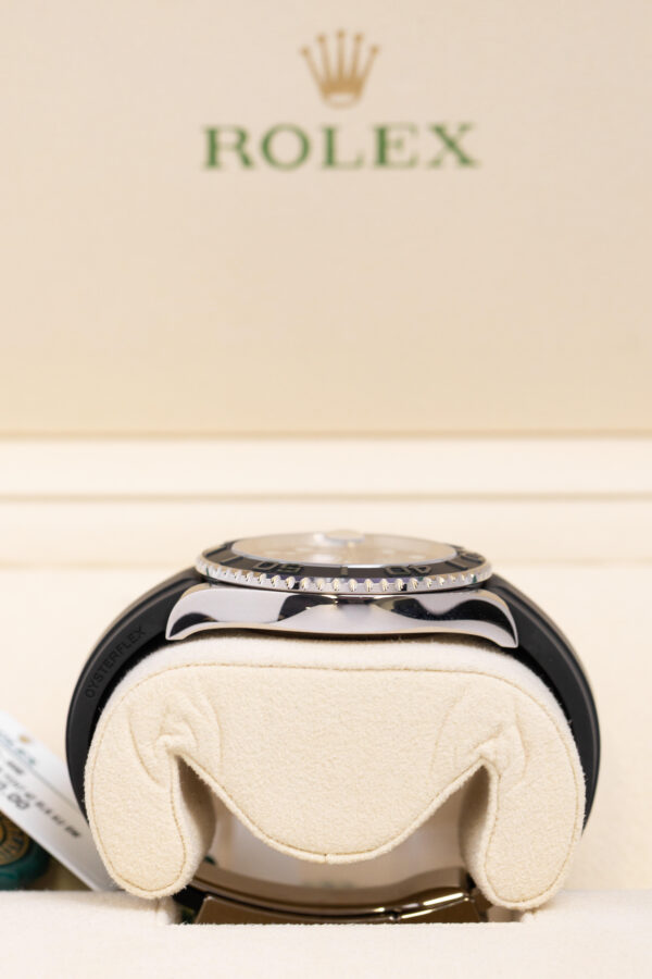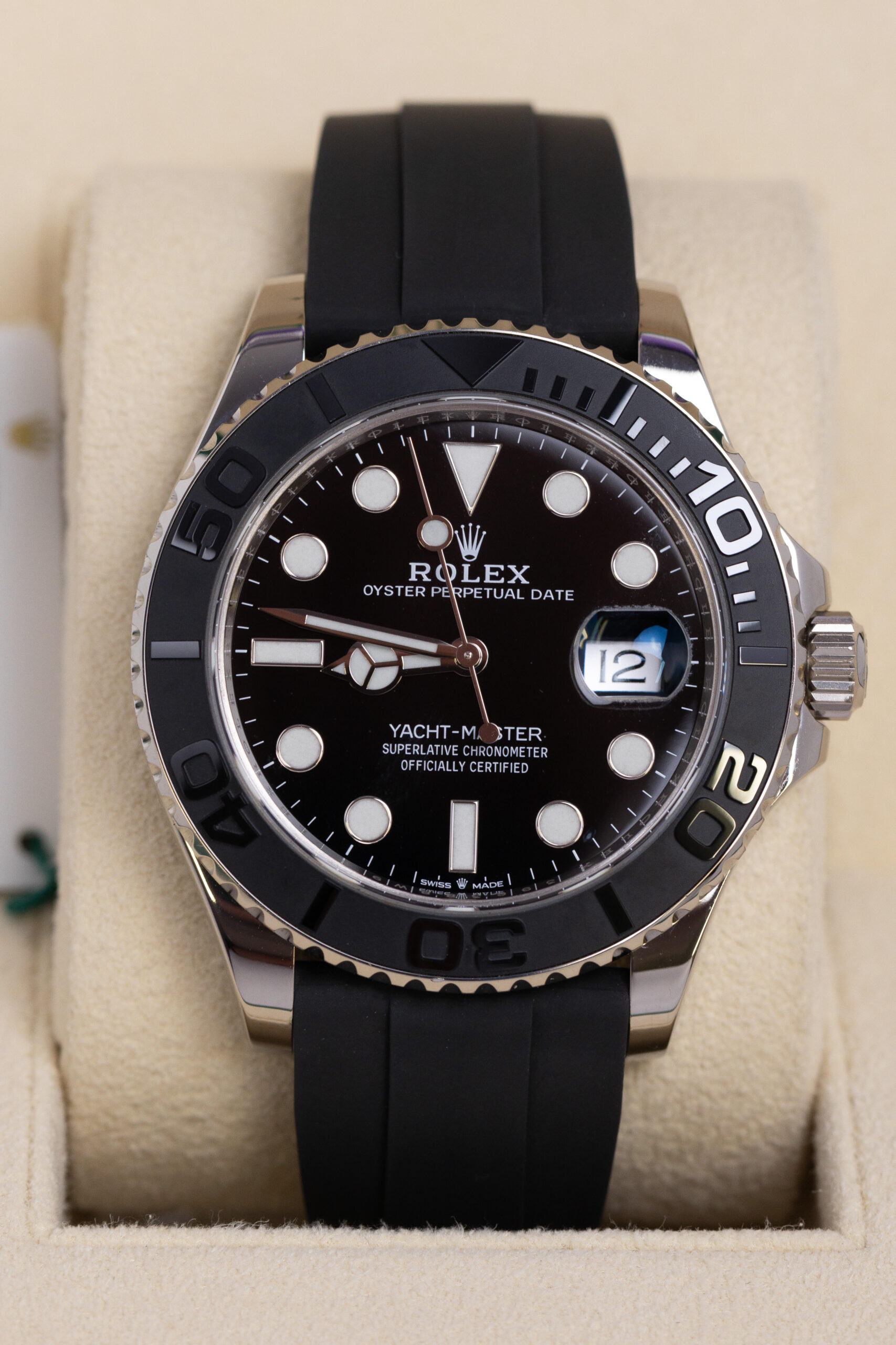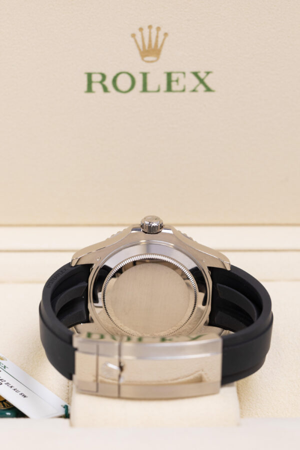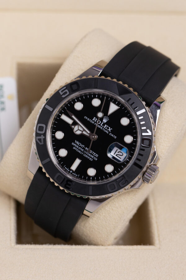 The Rolex Yacht-Master 42 2022 features a 42mm solid 18ct white gold case, matte black Cerachrom bezel with raised numerals, and black dial with Chromalight luminescent hour markers. It is powered by the automatic calibre 3235 with a 70-hour power reserve. The watch is fitted to the black Oysterflex rubber bracelet with white gold Oysterlock safety clasp.