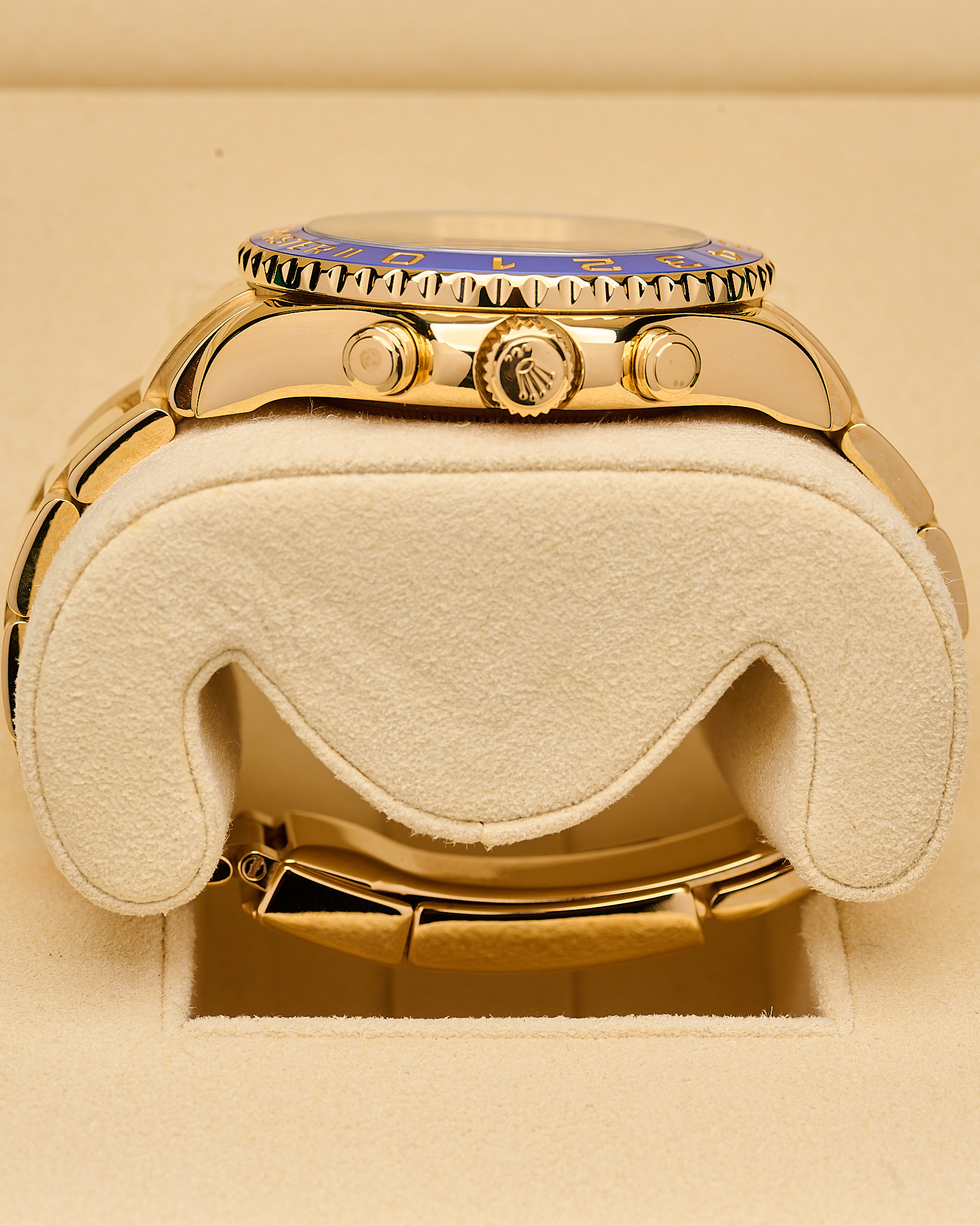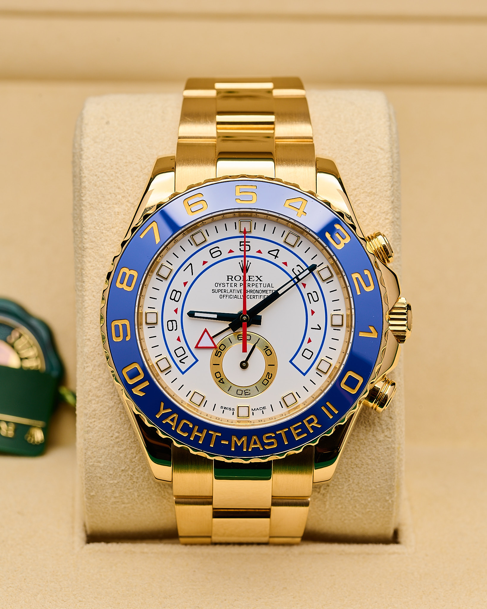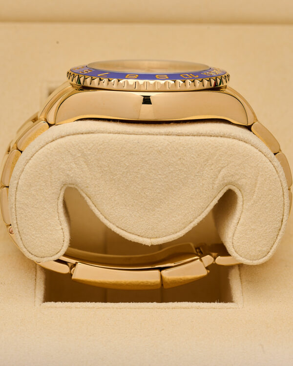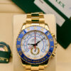 Powered by the Rolex Calibre 4161, this self-winding movement delivers unmatched accuracy and performance. The white lacquer dial, gold hands, and bold blue accents radiate confidence and sophistication.