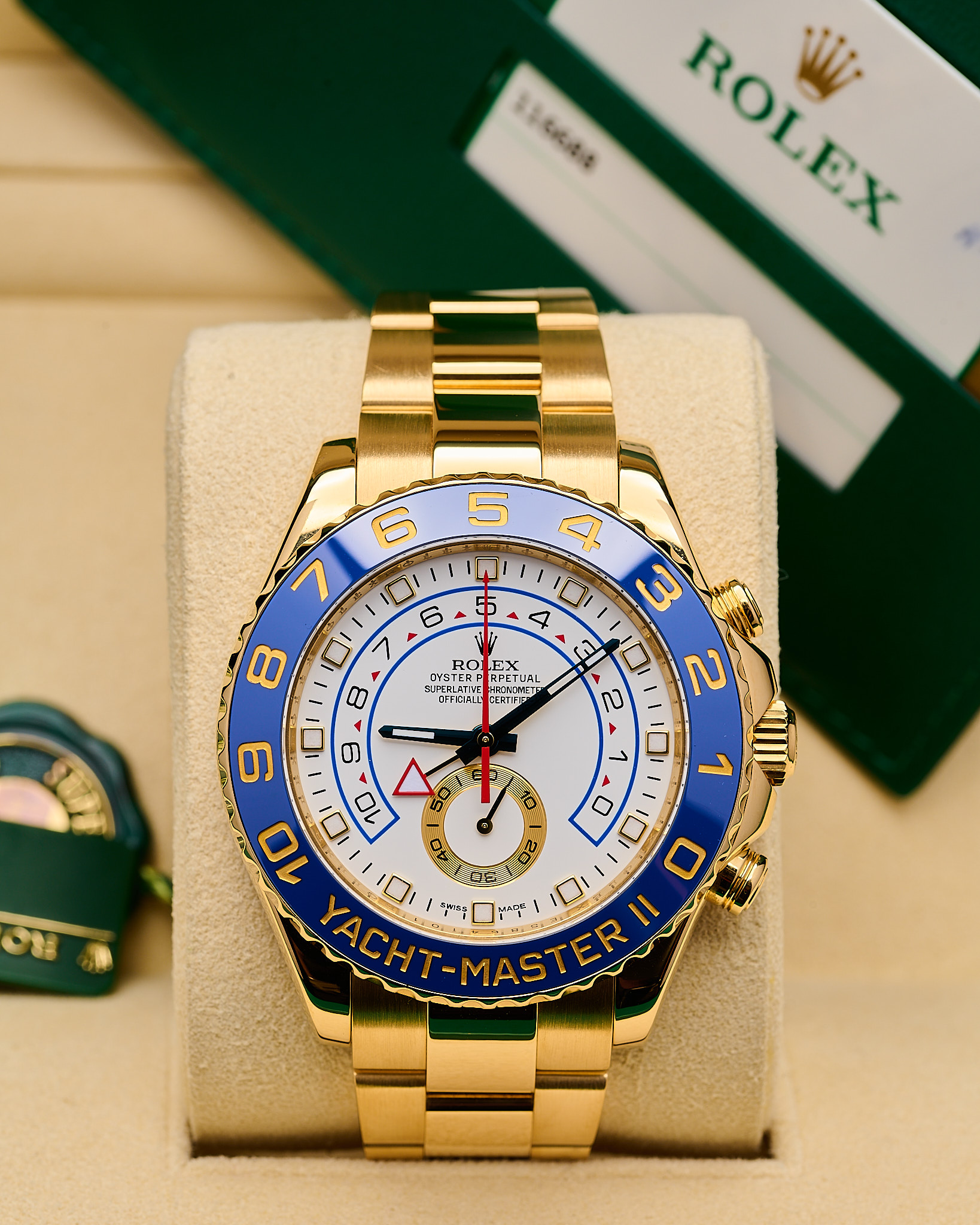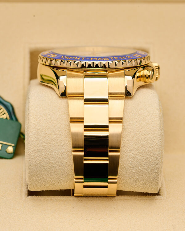 Crafted entirely in 18k yellow gold, the Rolex 116688 is more than a timepiece—it’s a statement of mastery. Featuring a 44mm Oyster case, blue Cerachrom bezel, and the signature regatta countdown chronograph, it’s engineered for those who command both sea and shore.