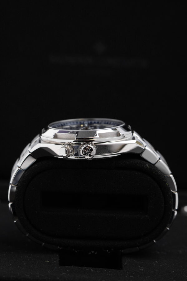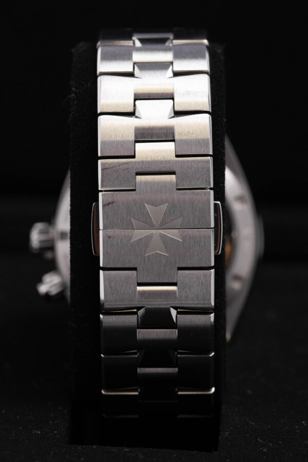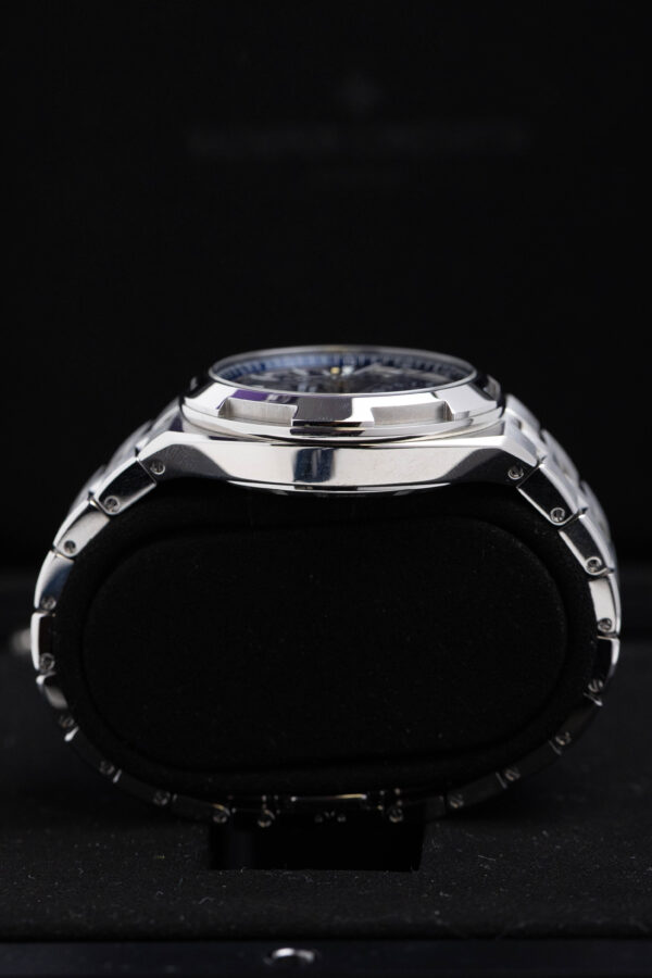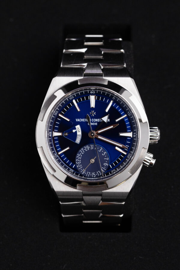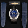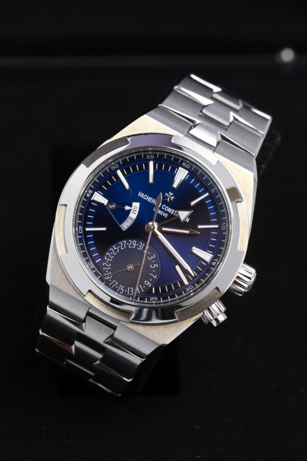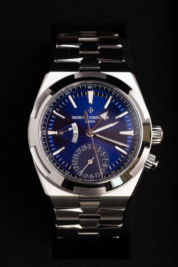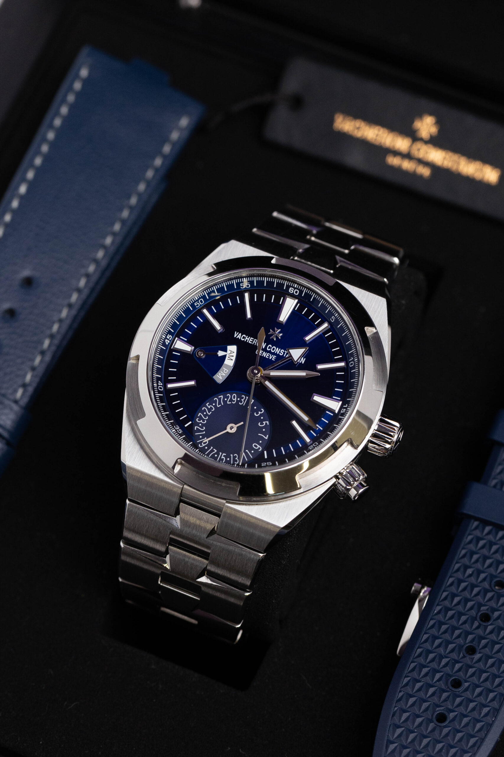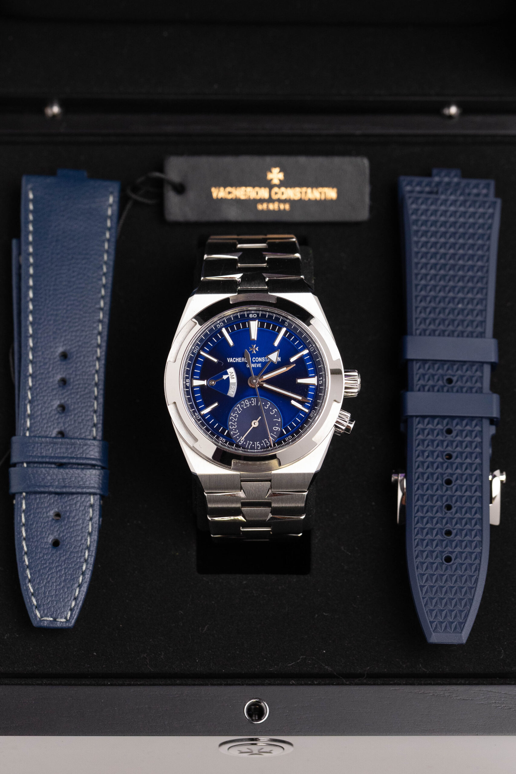 Its blue lacquered sunburst dial, lume-filled indexes, and integrated Maltese-cross–inspired bezel define the Overseas aesthetic, while the interchangeable bracelet/strap system offers tool-free transitions between steel, rubber, and leather.